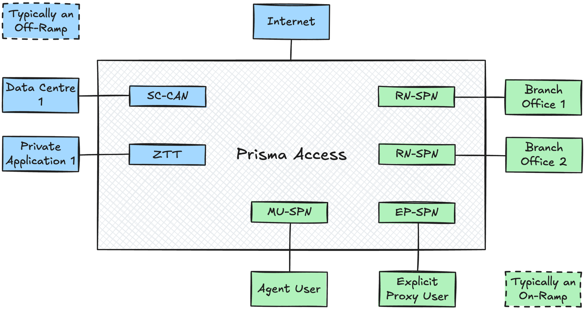 Prisma Access is a a composition of enforcement nodes, routing domains, and service insertion points. Traffic enters the enforcement fabric through regional locations. Traffic inspection and enforcement is carried out at compute locations, by the appropriate Security-Processing Node (SPN).