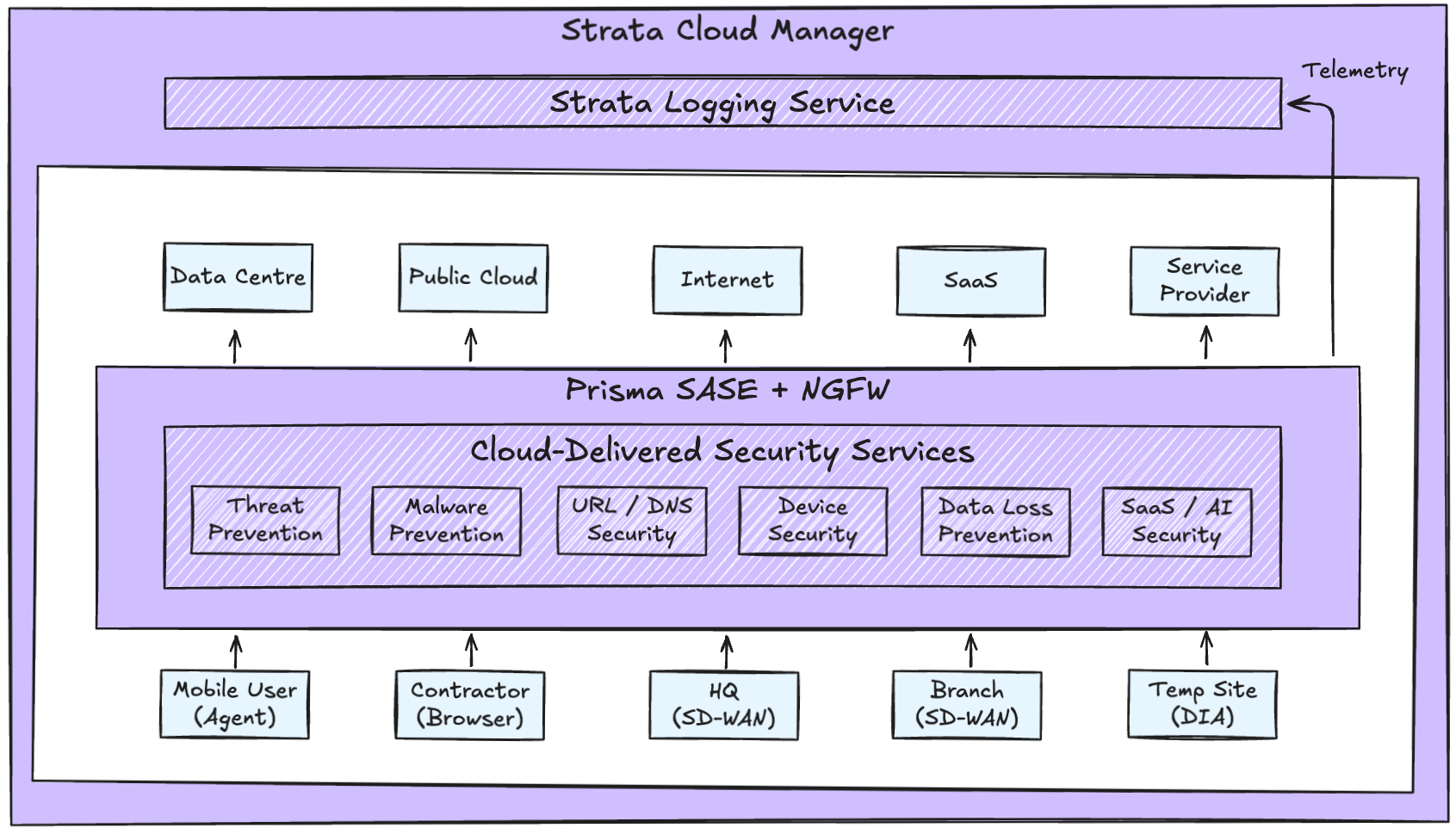 Enforcement remains distributed across firewalls and cloud-delivered services; policy authority and logging are centralised.